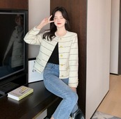 ジャケット ストライプ柄 大きいサイズ レディース レギュラー丈 ミディアム丈 長袖 ラウンドネック ボタン ポケット 無地 シンプル 通勤 デート 女子会 お出かけ 休日 韓国 イベント 20代 秋
