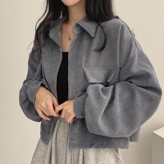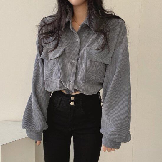 シャツ レディース コーデュロイ シャツジャケット パフスリーブ 長袖 ランタンスリーブ ショート丈 クロップド丈 ブラウス 羽織り ジャケット ライトアウター レトロ カジュアル おしゃれ
