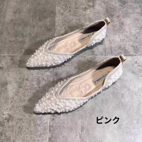 パンプス レディース パール フラットシューズ ポインテッドトゥ Vカット ビジュー ローヒールパンプス 1cmヒール ぺたんこ フラットパンプス きれいめ かわいい 華やか エレガント おしゃれ