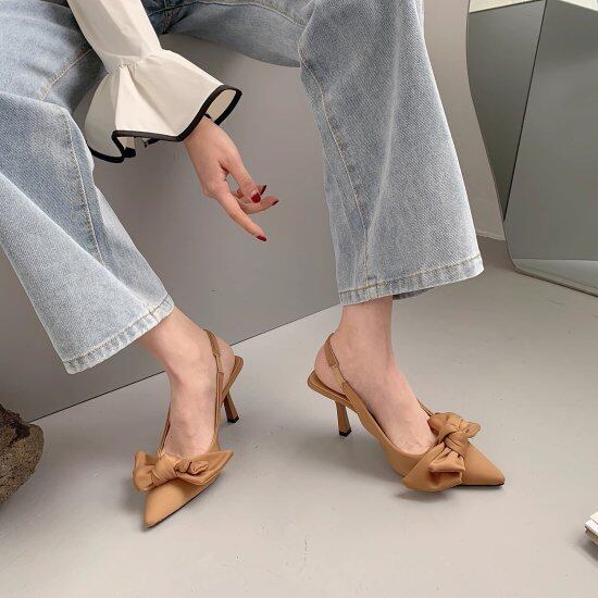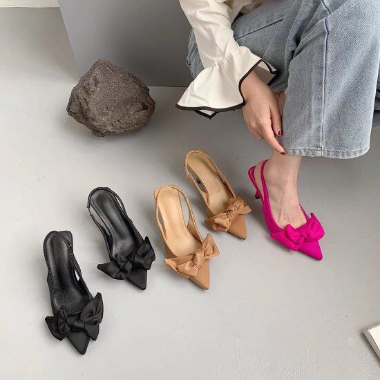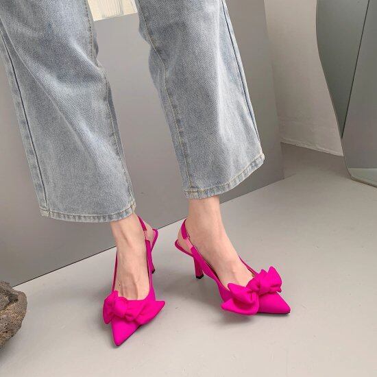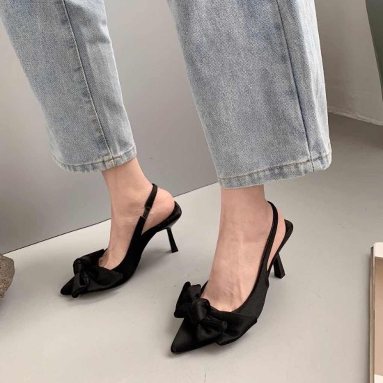 パンプス レディース バックストラップ リボン サンダル ポインテッドトゥ ピンヒール 5cmヒール ストラップサンダル フェイクレザー 浅い かわいい きれいめ ガーリー カジュアル おしゃれ