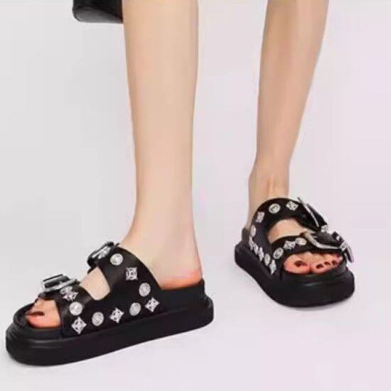 サンダル レディース 厚底サンダル スタッズ メタル ベルト レザーサンダル オープントゥ スリッパ 黒 ブラック ベルトサンダル ハード ゴシック ロック ユニセックス カジュアル おしゃれ