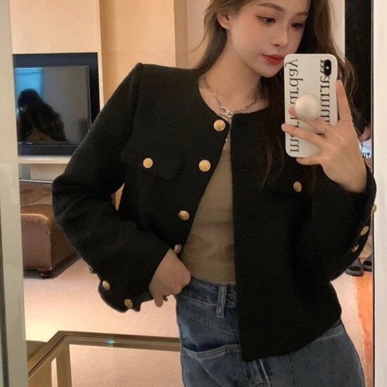 ジャケット レディース ツイードジャケット ノーカラージャケット 長袖 ショート丈 シングルブレスト ラウンドネック 金ボタン レトロ クラシカル きれいめ 上品 エレガント オフィス おしゃれ