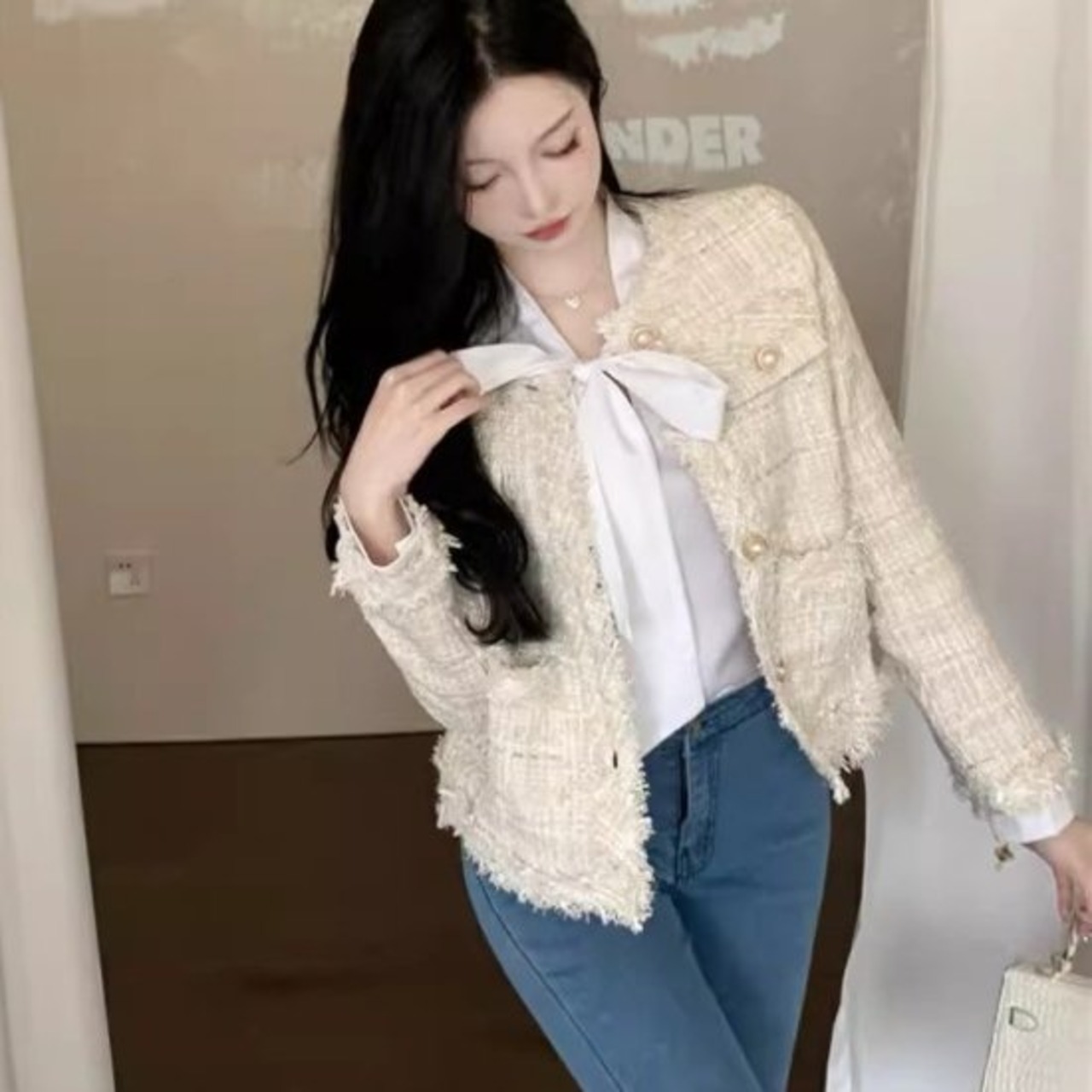 ジャケット レディース ツイードジャケット ノーカラージャケット 長袖 ラウンドネック フリンジ 金ボタン ショート丈 レトロ クラシカル きれいめ 上品 カジュアル オフィス デート おしゃれ