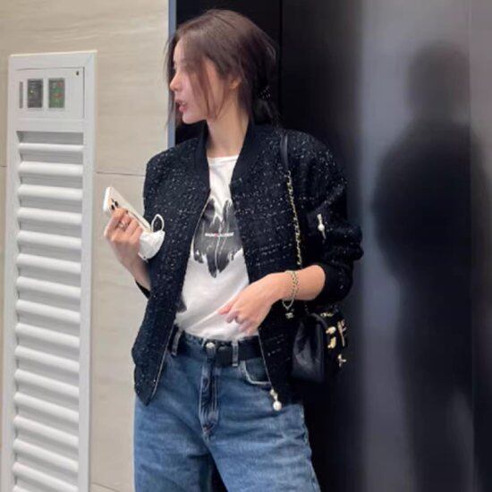 ブルゾン レディース ツイード ジッパー パール ショート丈ツイードジャケット ジャンパー ノーカラー 無地 レトロ シック かわいい きれいめ カジュアル スポーティー オフィス おしゃれ