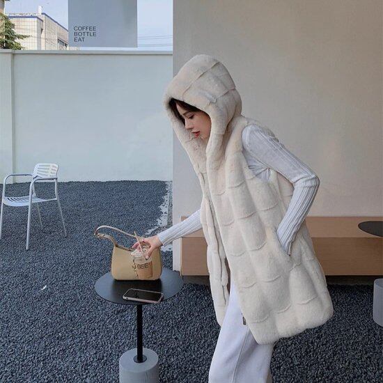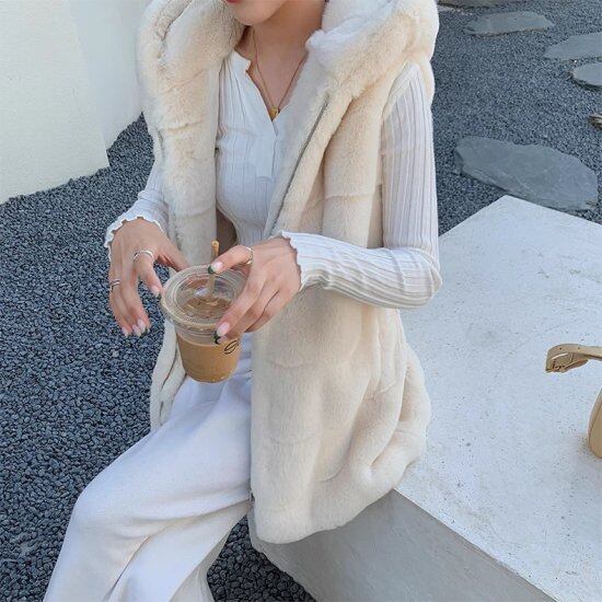 コーデのポイントになるフード付きフェイクファーベスト。