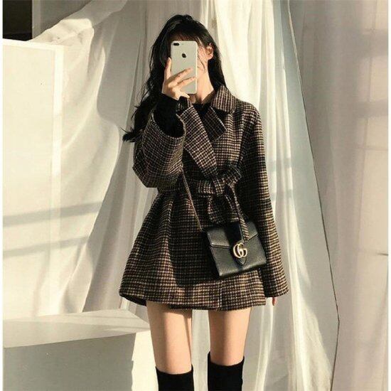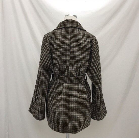 ジャケット チェック柄 大きいサイズ レディース レギュラー丈 ミディアム丈 チェック 2色 長袖 ウエスト紐 ポケット 無地 シンプル 通勤 デート 女子会 お出かけ レトロ 韓国 20代 秋冬