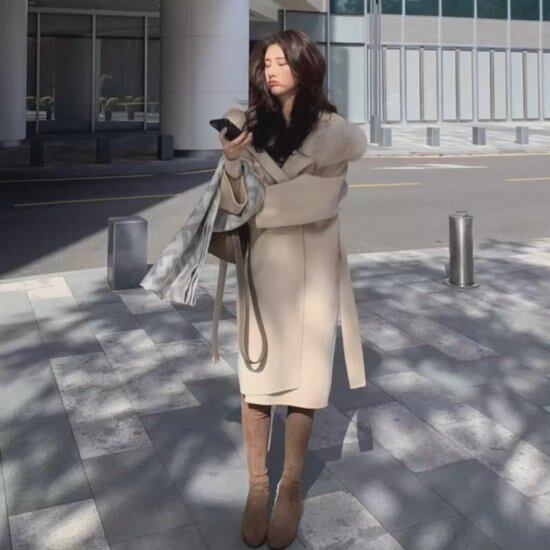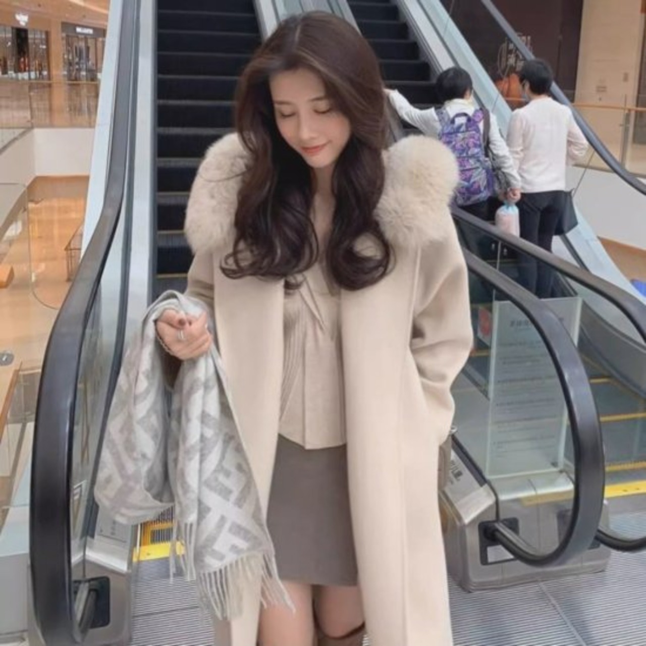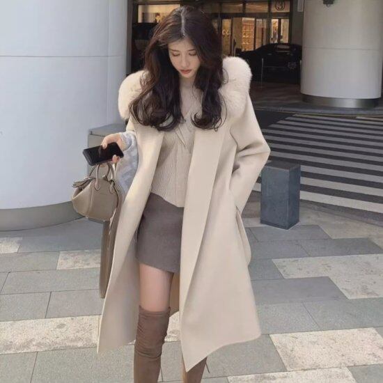 ハーフコート レディース ファーフード ミディアム丈 ベルト付き フード付きコート フェイクファー エコファー ウールタッチ ファーフードコート ウールライク きれいめ エレガント おしゃれ