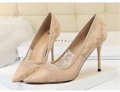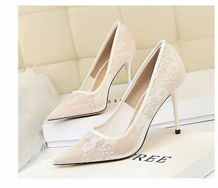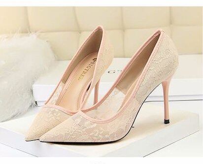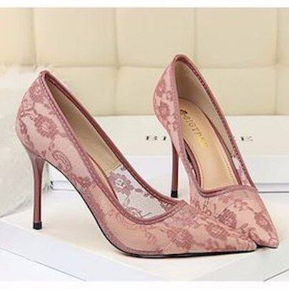 フラワーレースをあしらったシースルータイプのハイヒールパンプス。