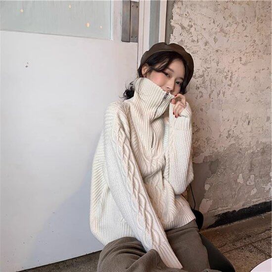 ニット レディース ハーフジップセーター ハイネック ケーブルニット オーバーサイズ ざっくり ルーズ ビッグシルエット ユニセックス ナチュラル リブニット カジュアル レトロ セーター おしゃれ