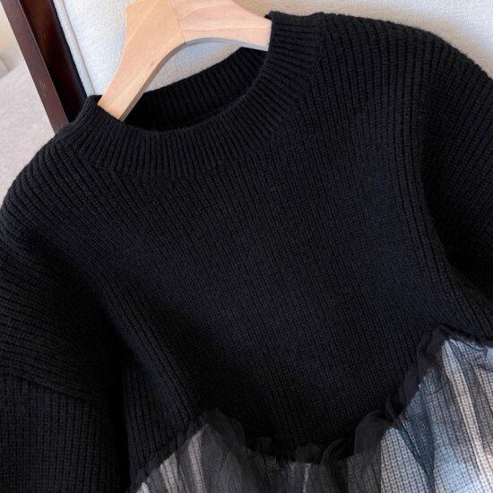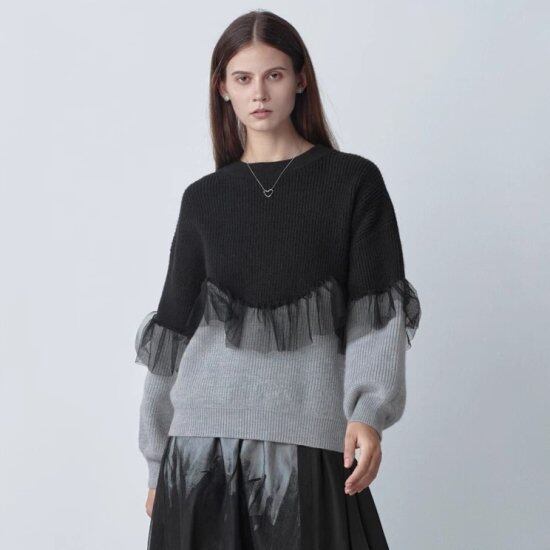 ニット レディース 切り替えセーター バイカラー 配色セーター カラーブロック レース 長袖 ラウンドネック パッチワークセーター プルオーバー 個性的 かわいい ガーリー カジュアル おしゃれ