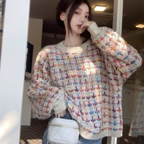 ニット レディース セーター チェック ラウンドネック 長袖 オーバーサイズ ざっくり 編み込み ミディアム丈 ゆったり ミックスカラー レトロ クラシック かわいい カジュアル おしゃれ