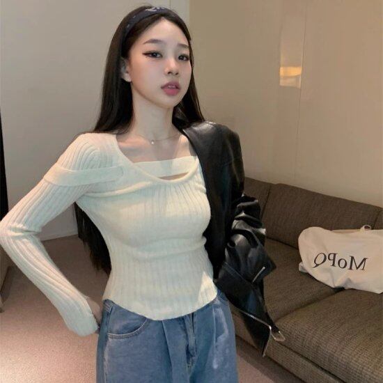 2wayのデザインで着られるタイトニットトップス。