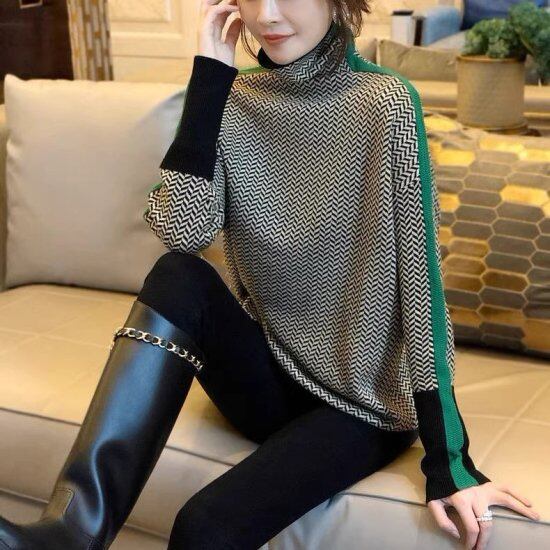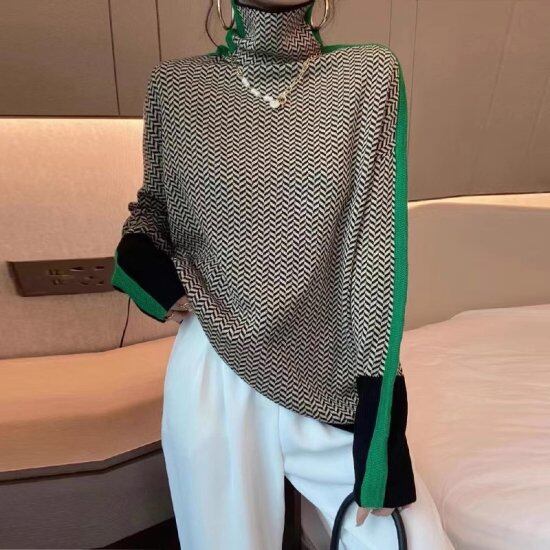 ニット レディース タートルネックセーター 総柄 ライン 長袖 ハイネック ヘリンボーン チェック柄 ウールタッチ レトロ クラシカル きれいめ カジュアル 大人 オフィス おでかけ おしゃれ