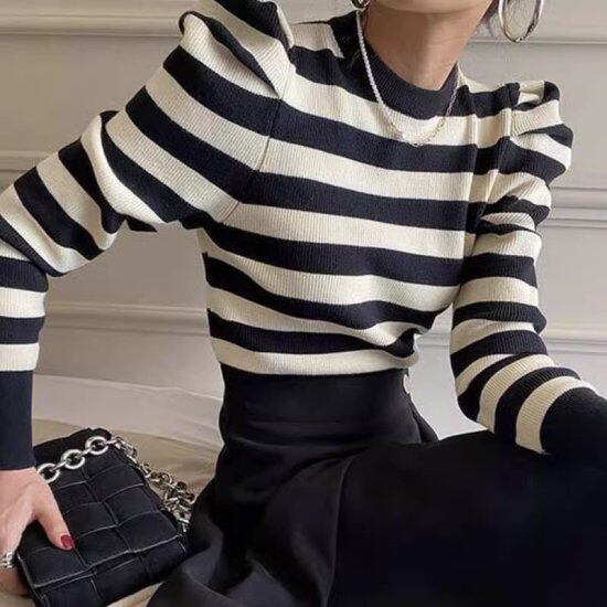 セーター レディース パフスリーブ ボーダー 長袖 スリム タイト リブニット ボリューム袖 クルーネック ラウンドネック ボーダートップス レトロ クラシカル きれいめ カジュアル おしゃれ