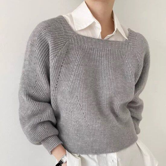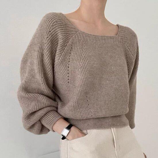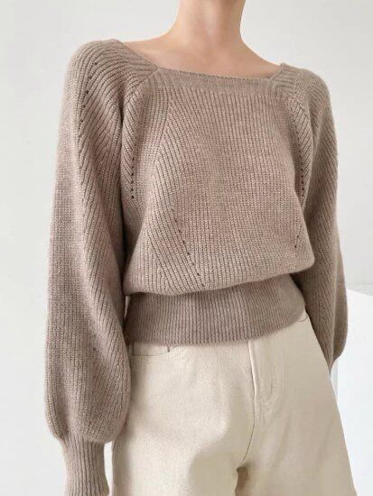 ニット レディース ショート丈セーター スクエアネック ボリューム袖 ランタンスリーブ 長袖 無地 シンプル クロップドセーター クロップドニット きれいめ 上品 カジュアル オフィス おしゃれ