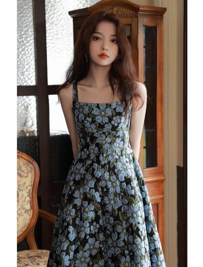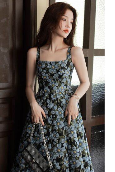 ワンピース レディース 花柄 ノースリーブワンピース スクエアネック ミモレ丈 ミディアム丈 ロング丈 Aライン スリム サスペンダー フレア きれいめ エレガント 結婚式 二次会 パーティー