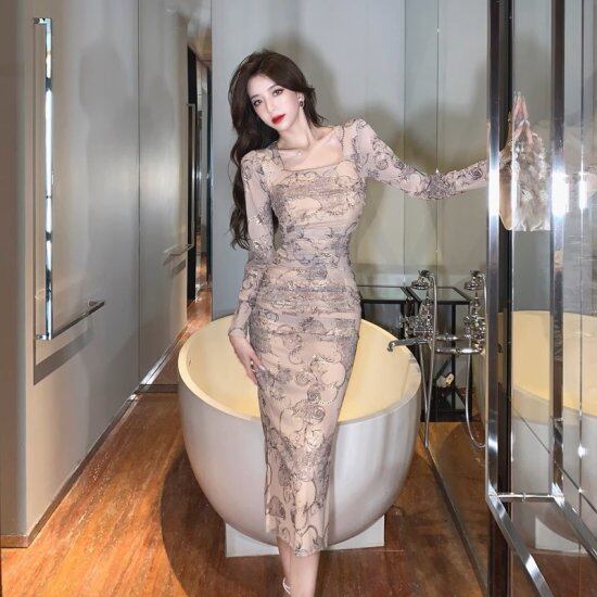 ワンピース レディース タイトワンピース スクエアネック 総柄 長袖 プリントワンピース サイドスリット 花柄 ボタニカル ミモレ丈 スリムフィット セクシー ドレス パーティードレス おしゃれ