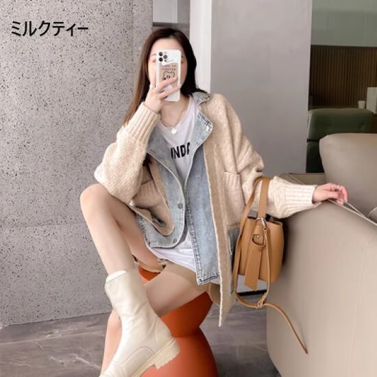 ニットカーディガン レディース カーディガン デニムジャケット 重ね着風 異素材ミックス ドッキングカーディガン 長袖 襟あり ゆったり オーバーサイズ カジュアル お出かけ おしゃれ ライトアウター