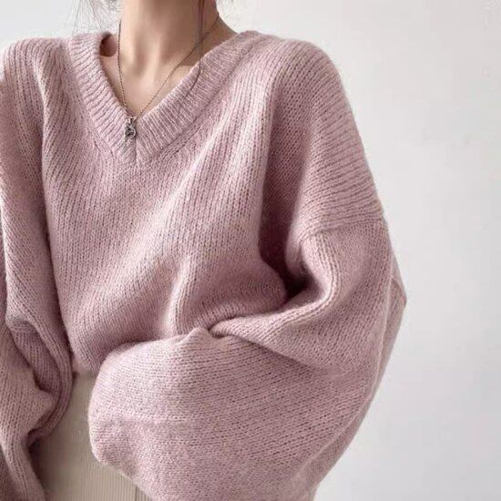 ニットセーター レディース Vネックセーター 長袖 オーバーサイズ 無地 ビッグシルエット ゆったり ボリューム袖 ロングニット ニット かわいい ガーリー おでかけ デート カジュアル おしゃれ