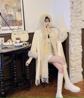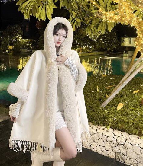 ケープコート レディース ファーコート ファートリミング フード付き フリンジ マント フェイクファー 羽織り フード付きコート ケープ きれいめ エレガント 華やか デート パーティー おしゃれ