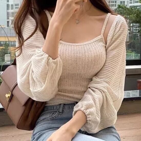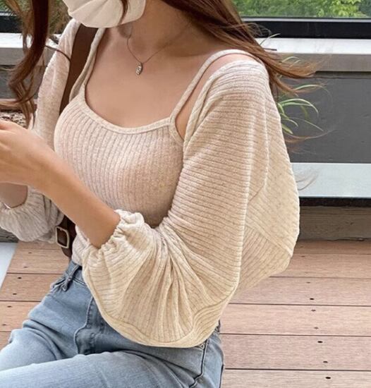 ニットカーディガン レディース カーディガン ニットキャミソール 2点セット ツーピース ショートカーディガン 長袖 ボリューム袖 トップス リブニット カジュアル お出かけ おしゃれ シンプル 無地