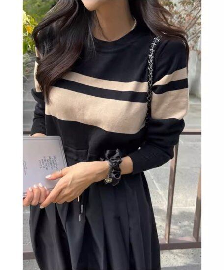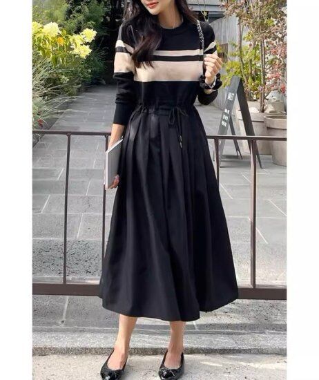 切り替えワンピース レディース 異素材MIX ボーダーニット ギャザースカート ミモレ丈 ロング丈 長袖 ラウンドネック クルーネック ドッキングワンピース レトロ カジュアル おでかけ おしゃれ
