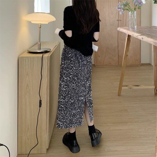 キラキラなスパンコールが華やかなミモレ丈スカート。