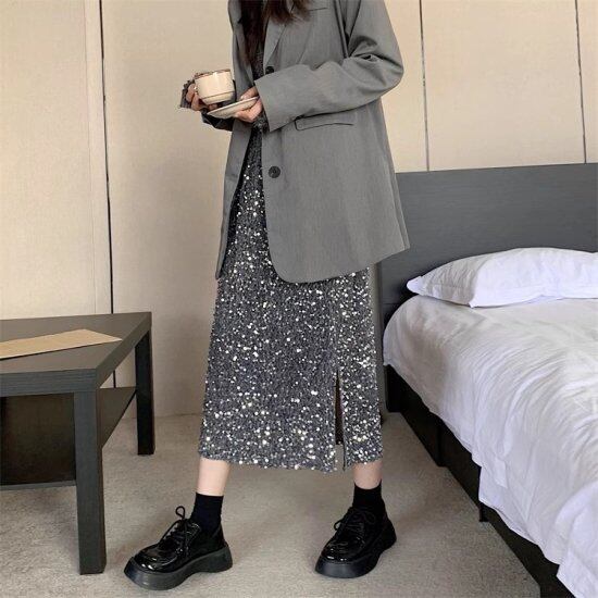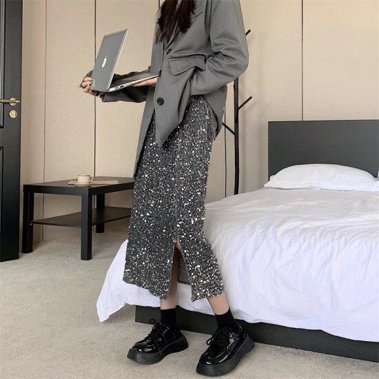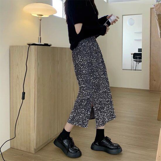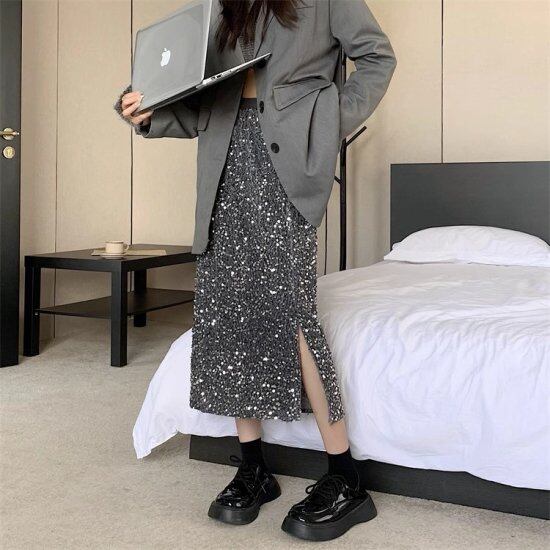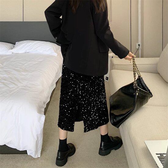 スカート レディース スパンコール ミモレ丈 ロング丈 ウエストゴム スリット キラキラ タイトスカート ストレート Aライン きれいめ カジュアル 華やか エレガント パーティー おしゃれ