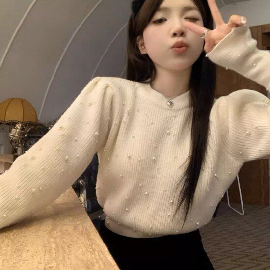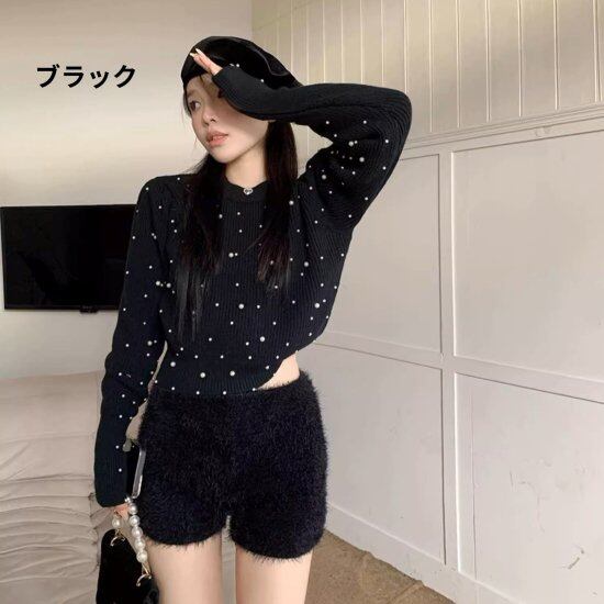 ニットセーター レディース パフスリーブ パール付き 長袖 ラウンドネック クルーネック ボリューム袖 ショート丈 クロップド丈 プルオーバー かわいい ガーリー デート エレガント おしゃれ