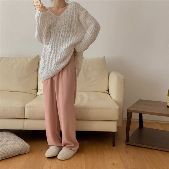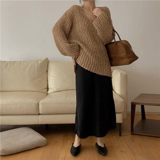 ニットセーター レディース Vネック ロングニット 長袖 プルオーバー ポップコーンニット ゆったり オーバーサイズ レトロ かわいい きれいめ ガーリー おでかけ オフィス 部屋着 おしゃれ