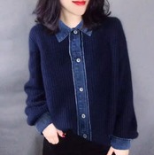 ニットトップス レディース トップス デニム 異素材ミックス ドッキング フェイクツーピース 重ね着風 フロントボタン 長袖 ニット セーター ボリューム袖 襟あり ポロ襟 カジュアル 個性的 女性