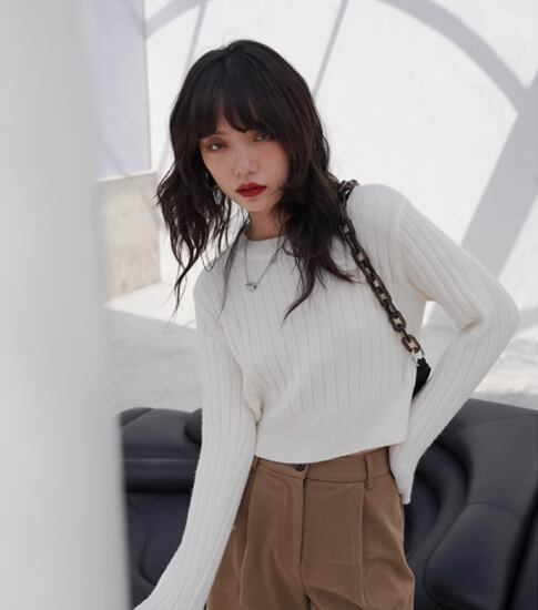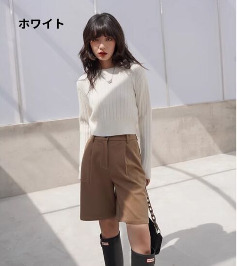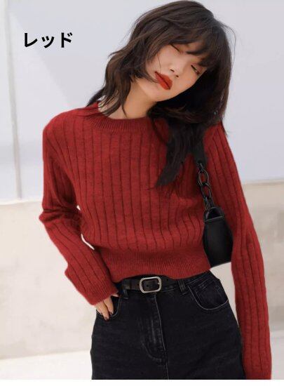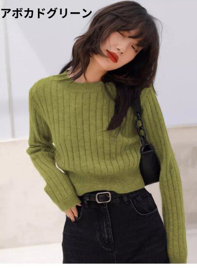 ニットセーター レディース リブニット ショート丈 クロップド丈 長袖 ラウンドネック クルーネック スリム 無地 クロップドニット レトロ きれいめ かわいい カジュアル オフィスコーデ おしゃれ