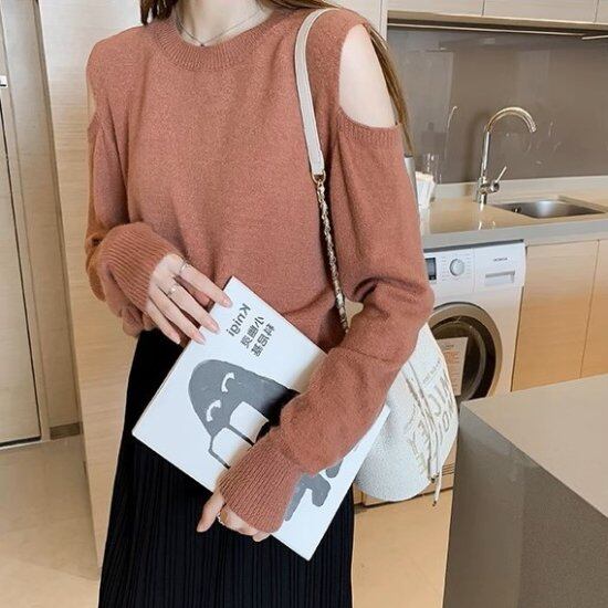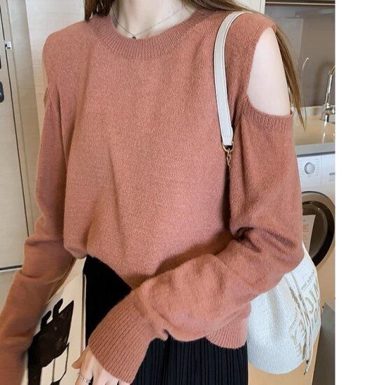 ニットセーター レディース 肩出し ショルダースリット カットワーク 長袖 ラウンドネック クルーネック 無地 シンプル 個性的 肩見せ 肌見せ かわいい きれいめ カジュアル ガーリー おしゃれ