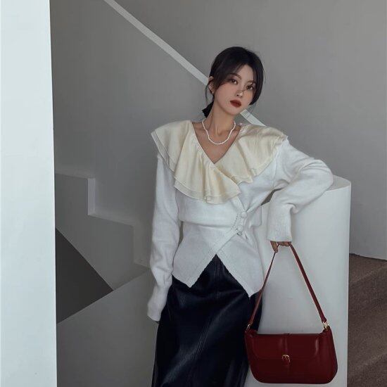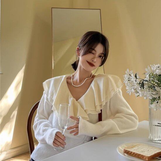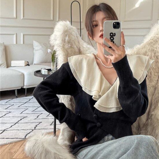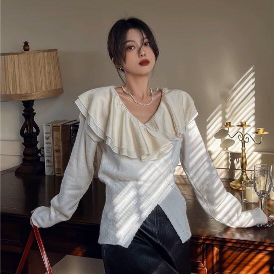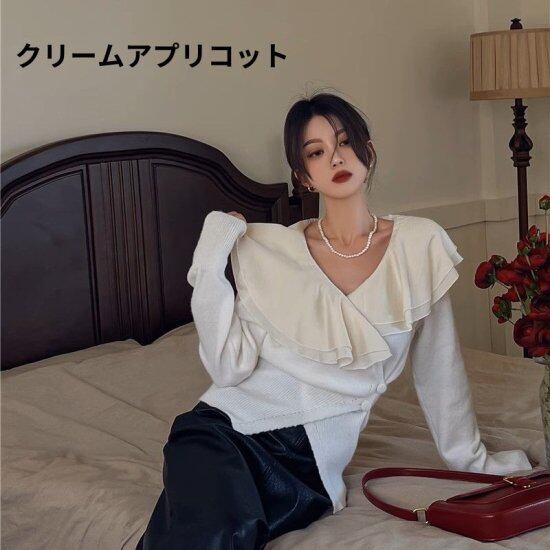 ニットセーター レディース フリル カーディガン カシュクール Vネック 長袖 プルオーバー フリル襟 レトロ クラシカル きれいめ かわいい エレガント おでかけ デート お呼ばれ おしゃれ