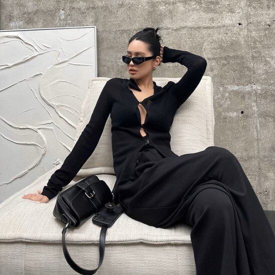 伸縮性のある薄手のニットカーディガン。