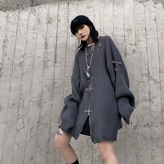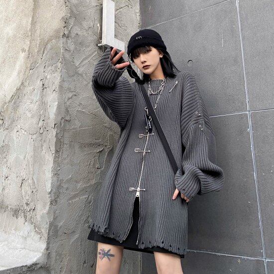 ニットセーター レディース ダメージニット ハーフジップ オーバーサイズ ジップアップ ビッグシルエット ラウンドネック ワンピース ロングニット ロングセーター ストリート 個性的 カジュアル