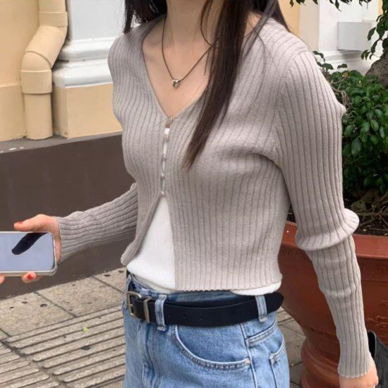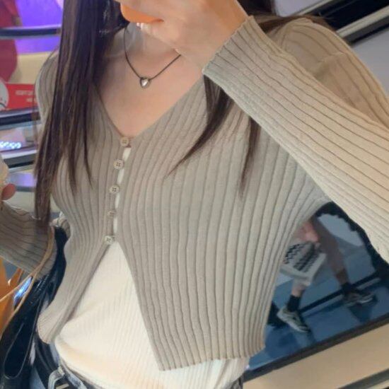 ニットカーディガン レディース ショート丈カーディガン 長袖 Vネック リブニット タイト ボタン スリット ショート丈 クロップド丈 かわいい きれいめ カジュアル 3color おしゃれ
