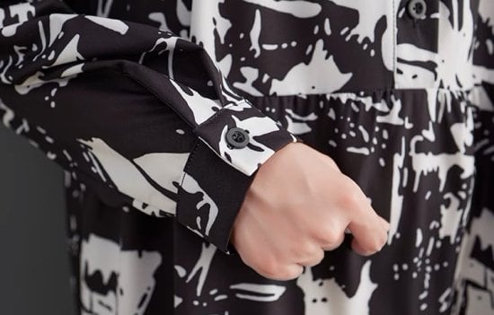 ロングワンピース レディース ティアードワンピース 長袖 バンドカラー ノーカラー 抽象柄 総柄 グラフィック 個性的 Aライン ロング マキシ丈 プリントワンピース きれいめ カジュアル おしゃれ