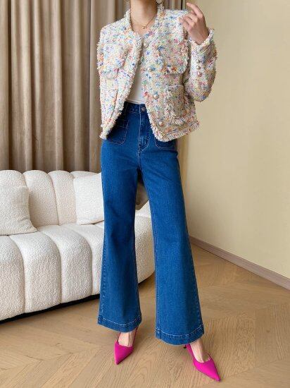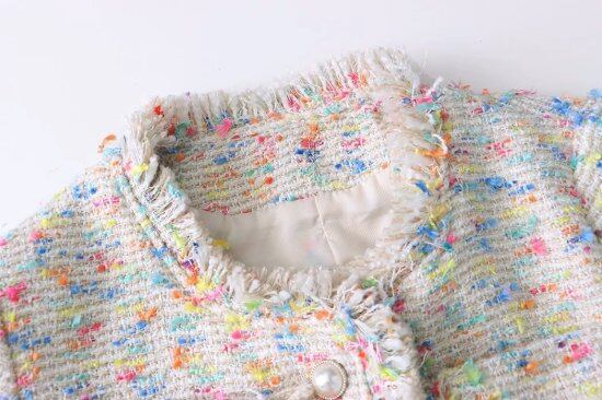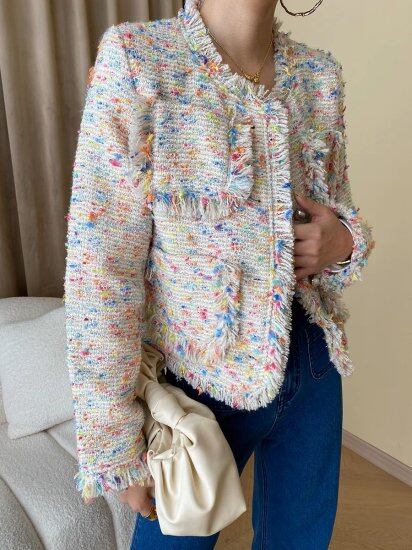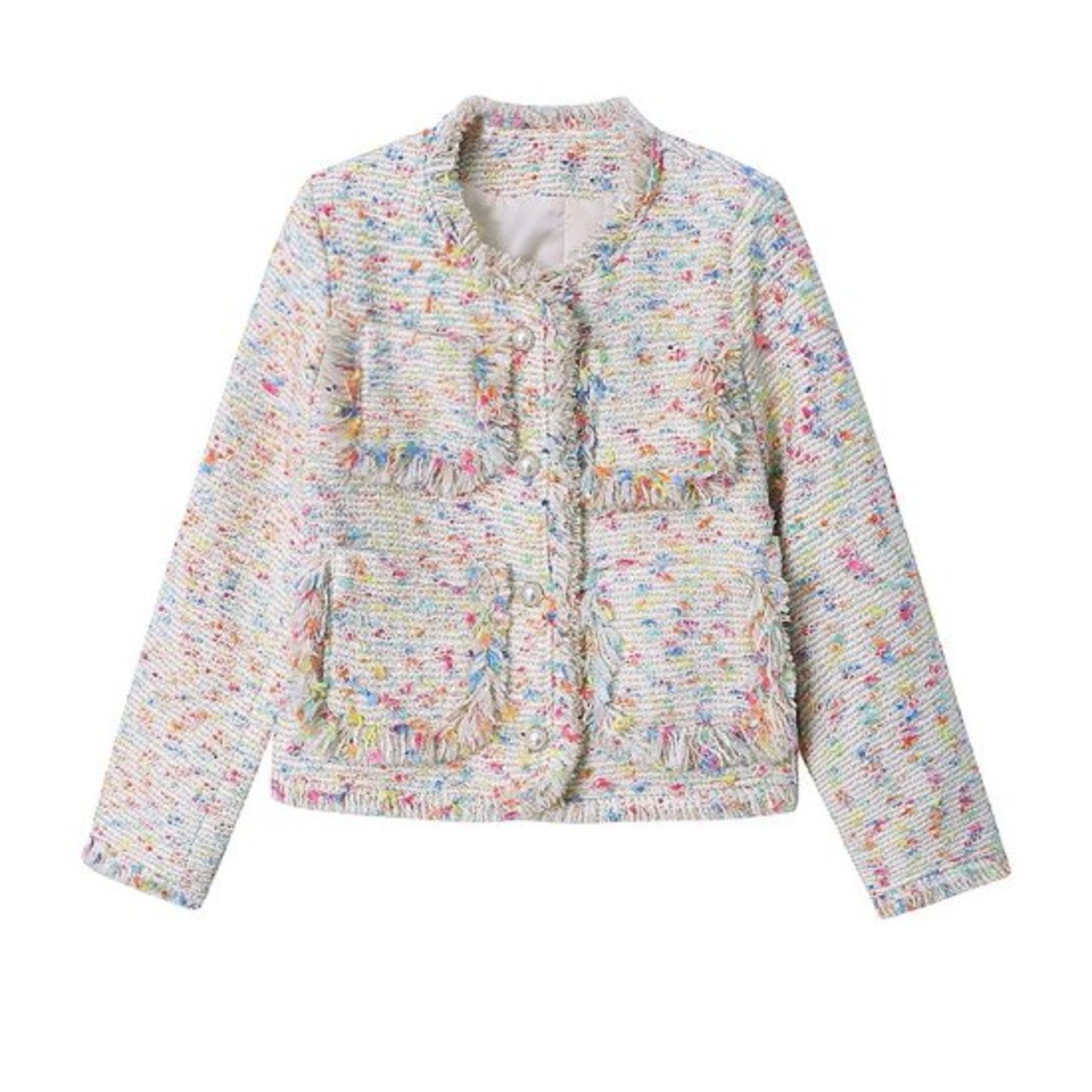 ツイードジャケット レディース ショートジャケット ミックスツイード 長袖 ノーカラー フリンジ パールボタン ポケット パステルカラー カラフル エレガント きれいめ 上品 カジュアル おしゃれ
