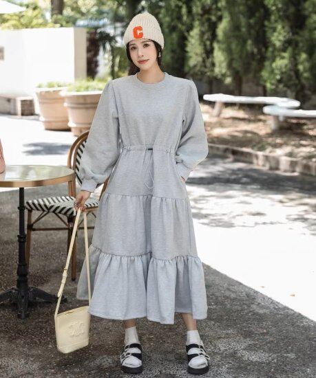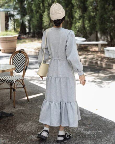 ロングワンピース レディース ティアードワンピース スウェット 長袖 ラウンドネック 無地 ロング丈 Aラインワンピース プリンセス ボリューム あたたか 厚手 カジュアル かわいい おしゃれ
