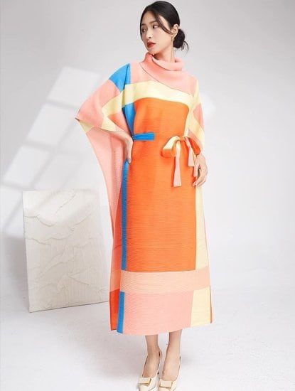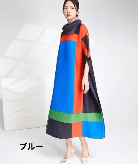 ロングワンピース レディース 配色ワンピース カラーブロック ハイネック バットスリーブ ウエストリボン プリーツ ドレス ミモレ丈 ロング丈 個性的 きれいめ エレガント パーティー おしゃれ