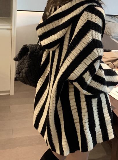 バイカラーのストライプ柄がおしゃれなカーディガン。