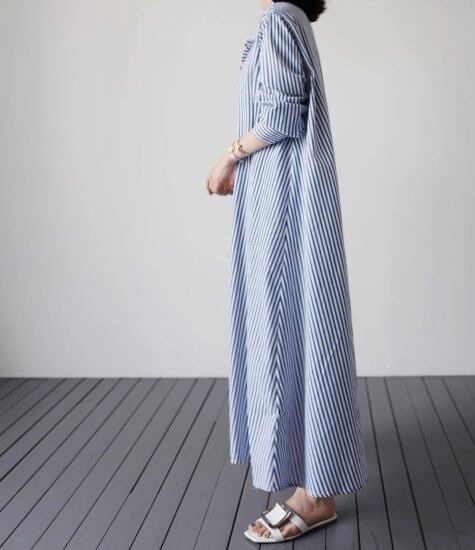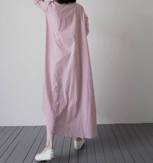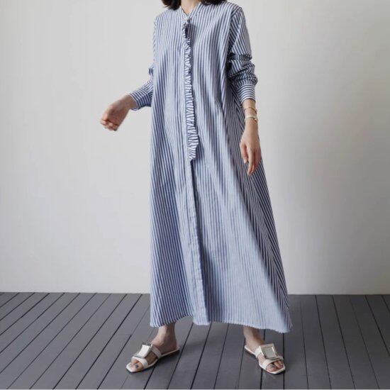 シャツワンピース レディース ロングワンピース ストライプ フリル ノーカラー スタンドカラー 長袖 ロング丈 ゆったり 体型カバー かわいい カジュアル リラックス 部屋着 ワンピース おしゃれ