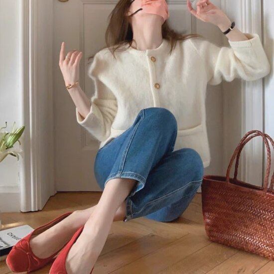 ニットカーディガン レディース セーター ニットジャケット ラウンドネック 長袖 ゴールドボタン ショート丈 クロップド丈 かわいい きれいめ 上品 エレガント カジュアル カーディガン おしゃれ