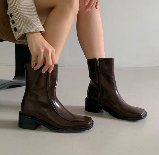 ショートブーツ レディース ブーツ 靴 シューズ サイドジッパー スクエアトゥ PU 太ヒール チャンキーヒール シンプル 無地 カジュアル お出かけ おしゃれ 美脚 脚長 きれいめ 履きやすい 女性