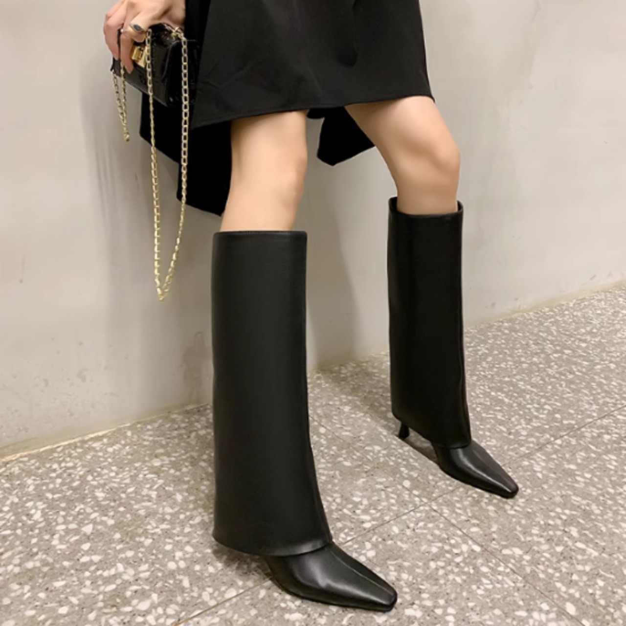 ロングブーツ レディース ブーツ 靴 シューズ 折り返しデザイン スティレットヒール ハイヒール シンプル 無地 美脚 脚長 個性的 カジュアル お出かけ おしゃれ ファッションブーツ 黒 白 女性