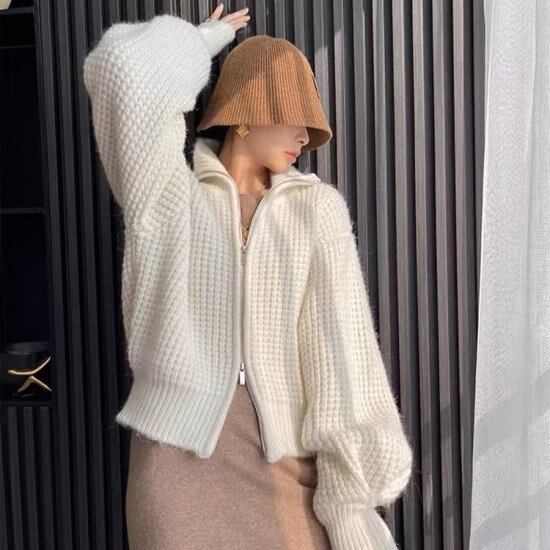 ニットカーディガン レディース ジップアップ ニットジャケット セーター 長袖 スタンドカラー ハイネック ショート丈 ボリューム袖 レトロ クラシカル きれいめ カジュアル オフィス おしゃれ