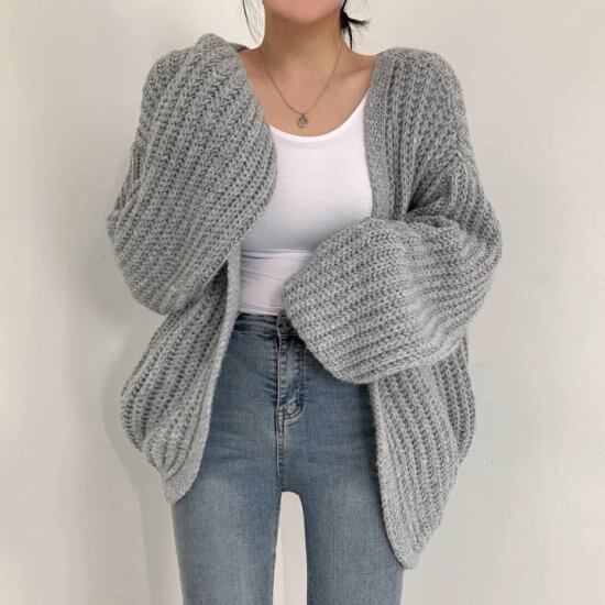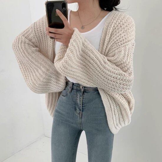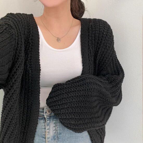 ニットカーディガン レディース ボリューム袖 ルーズ ゆるニット ざっくり ローゲージ オーバーサイズ 羽織り 長袖 ボタンなし ランタンスリーブ ジャケット レトロ かわいい カジュアル おしゃれ