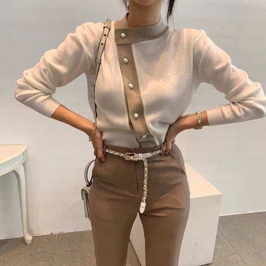 ニットカーディガン レディース アシンメトリー ニットセーター バイカラー 長袖 スタンドカラー ハイネック ハーフネック 2way レトロ クラシカル きれいめ エレガント オフィス おしゃれ