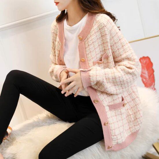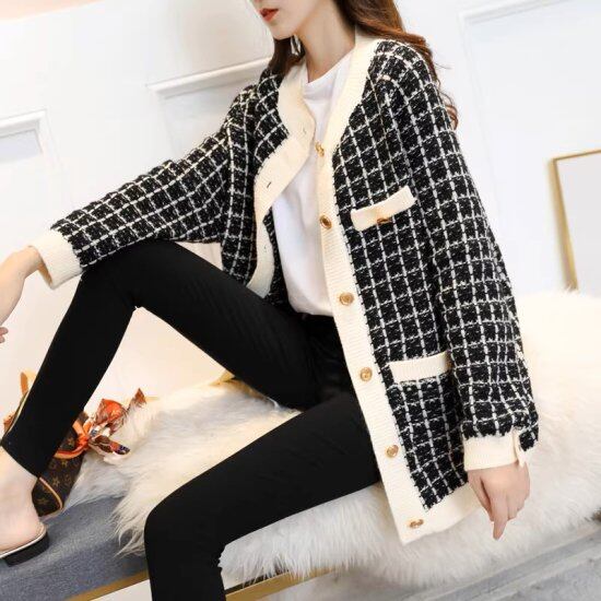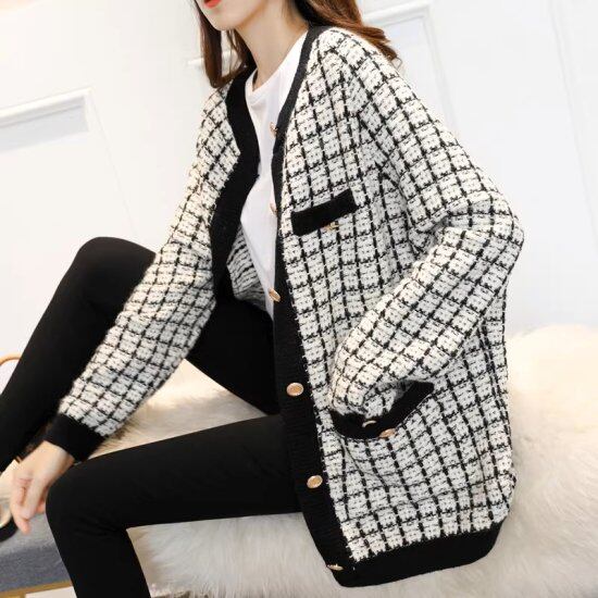 ニットカーディガン レディース ロングカーディガン チェック柄 ツイード ニットジャケット 長袖 ラウンドネック ゴールドボタン レトロ クラシカル オーバーサイズ きれいめ カジュアル おしゃれ
